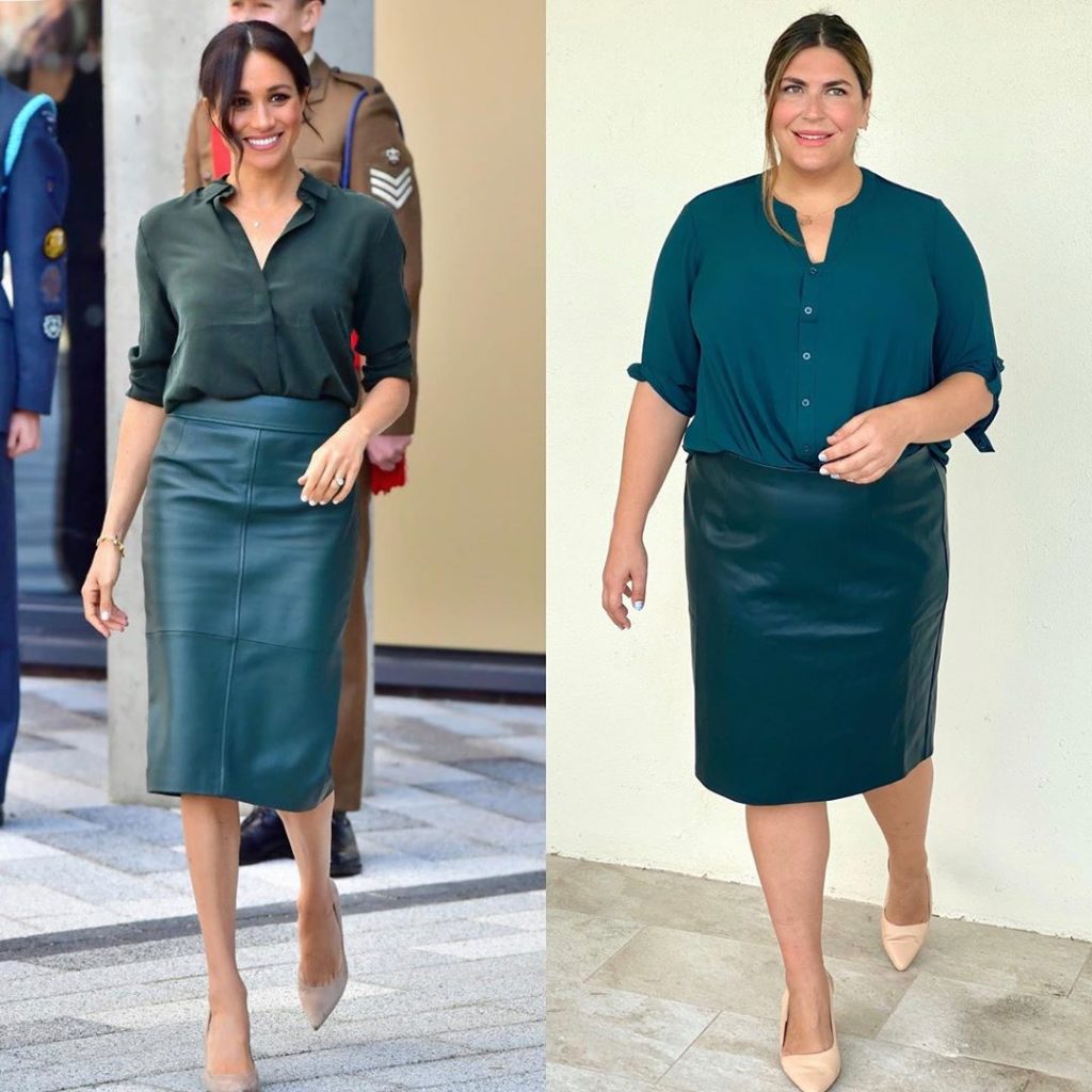Katie beherrscht oft Meghans Looks, weil sie leicht kreativ sind, insbesondere für Plus-Größenschnuschen. Dieser ist ein Traum in Green - Katies Version hat ein wenig von einem anderen Knopfstil in der Front, aber sie hielt den nackten spitzen Schuhen und den Lederrock. Dieser Look ist perfekt professionell.