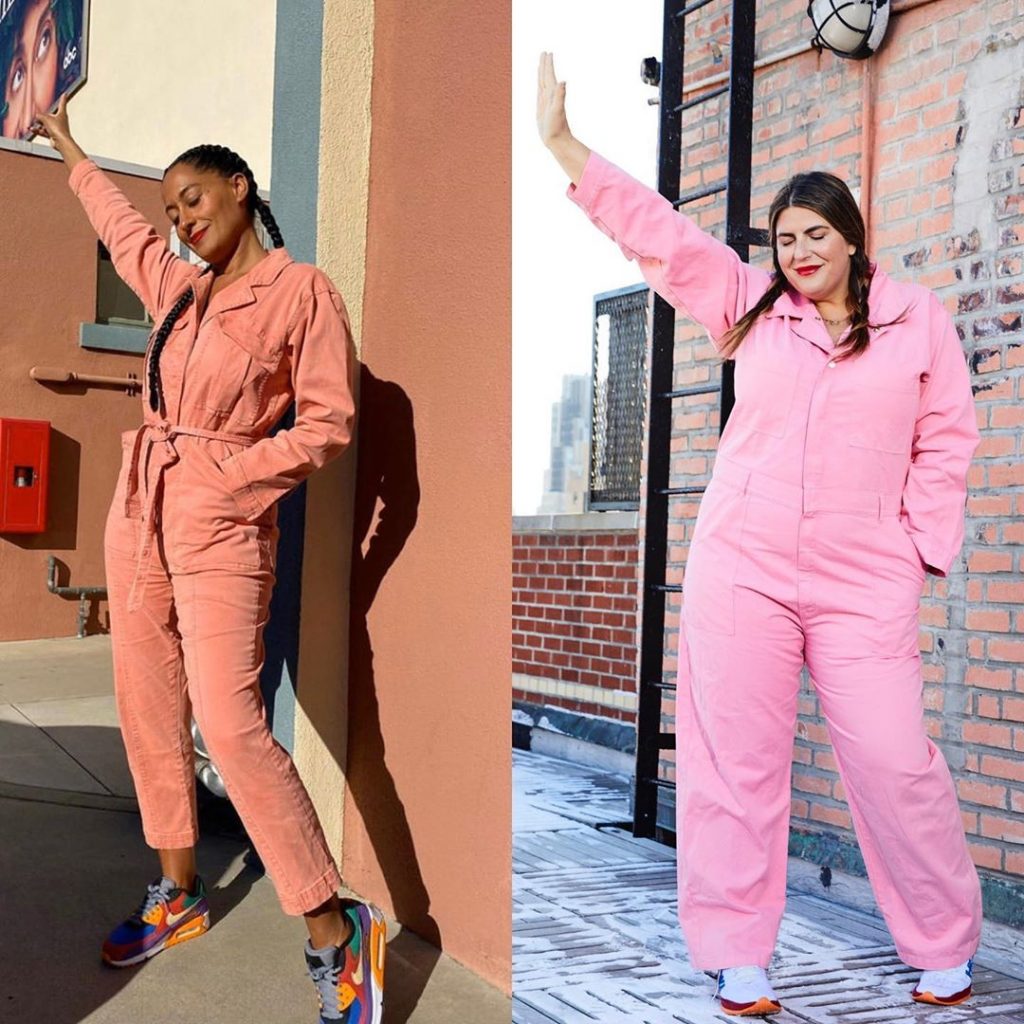 Ein vollgrößerer rosafarbener Overall ist nicht am einfachsten zu ziehen. Die meisten Leute sehen aus wie ein Hausmeister, der Pepto Bismol auf sie verschüttet hatte, aber beide Katie Sturino und Tracee Ellen Ross erschütterten diesen Look mit Leichtigkeit und Finesse. Dieser Beitrag hatte ein Versuch, größere Mädchen aus ihrer Komfortzone herauszuholen und etwas einschüchterndes zu tragen - ein Overall mit einem großen Farbguck.