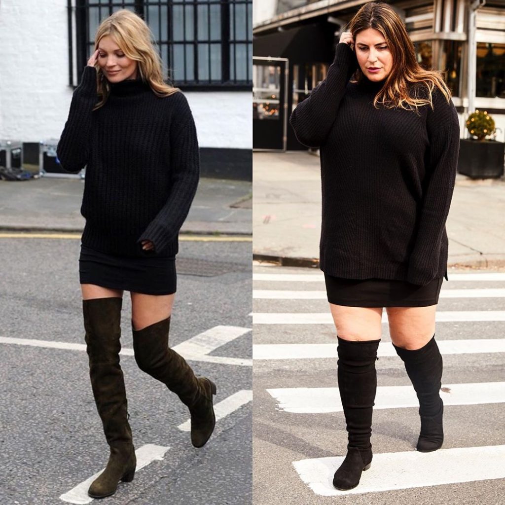 Oberschenkelhöhe und ein Rollkragenpullover ist wahrscheinlich unser bevorzugtes Saison-Übergangs-Outfit, aber wir sehen uns nicht, um den Blick auf kurvige Modelle zu oft zu sehen - meistens dünne Modelle, a LA der ursprüngliche Kate-Mossstil. Kate's Boots sind von Stuart Weitzman und wir brauchen sie so schnell wie möglich - süß und in einer Reihe von Größen erhältlich? Ja bitte.