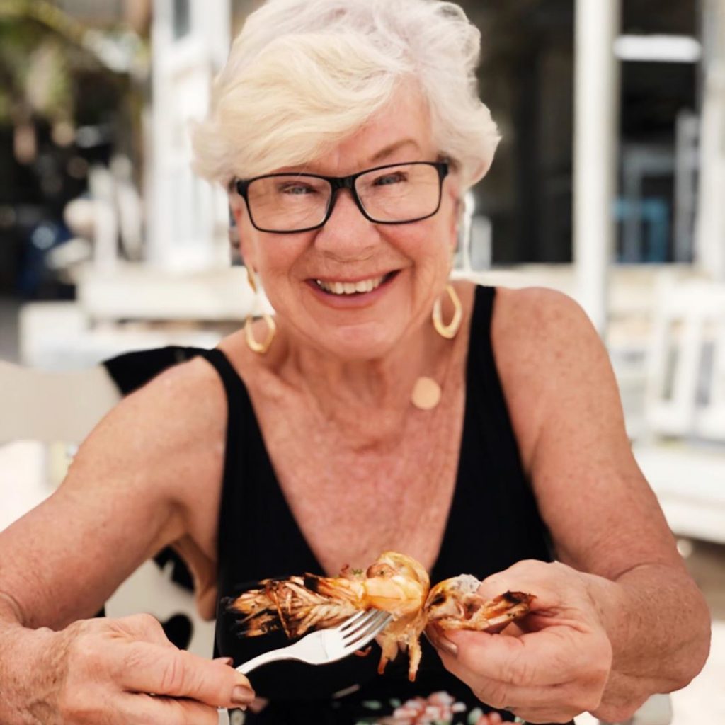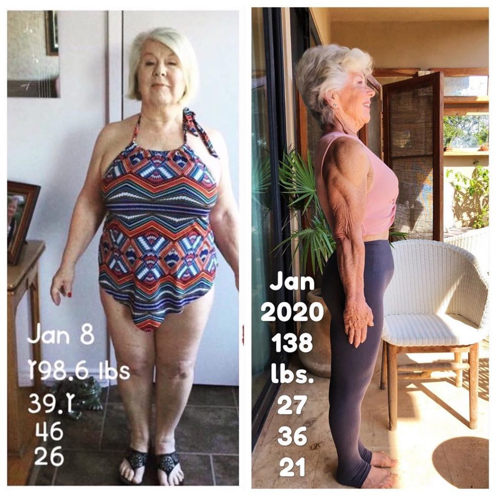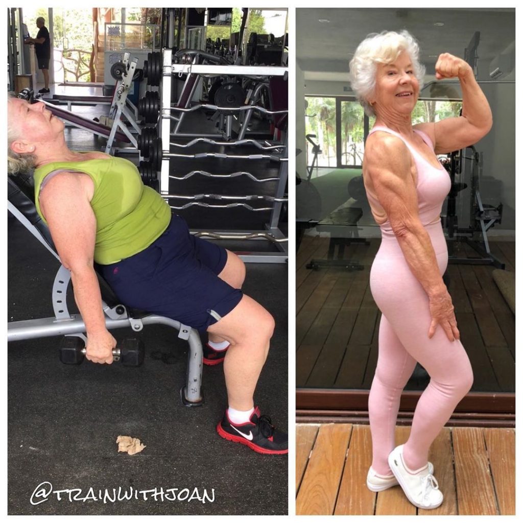 Wenn Sie dies lesen und Ihren Kopf mit einer persönlichen Entschuldigung schütteln, erinnern Sie sich an die Gesundheitskämpfe, die Joan durchging, und dass sie ihre Knie kaum beugen konnte. Heute, mit kraftvollen Kniebenen und Kreuzheben, tötet sie absolut ihr Training.