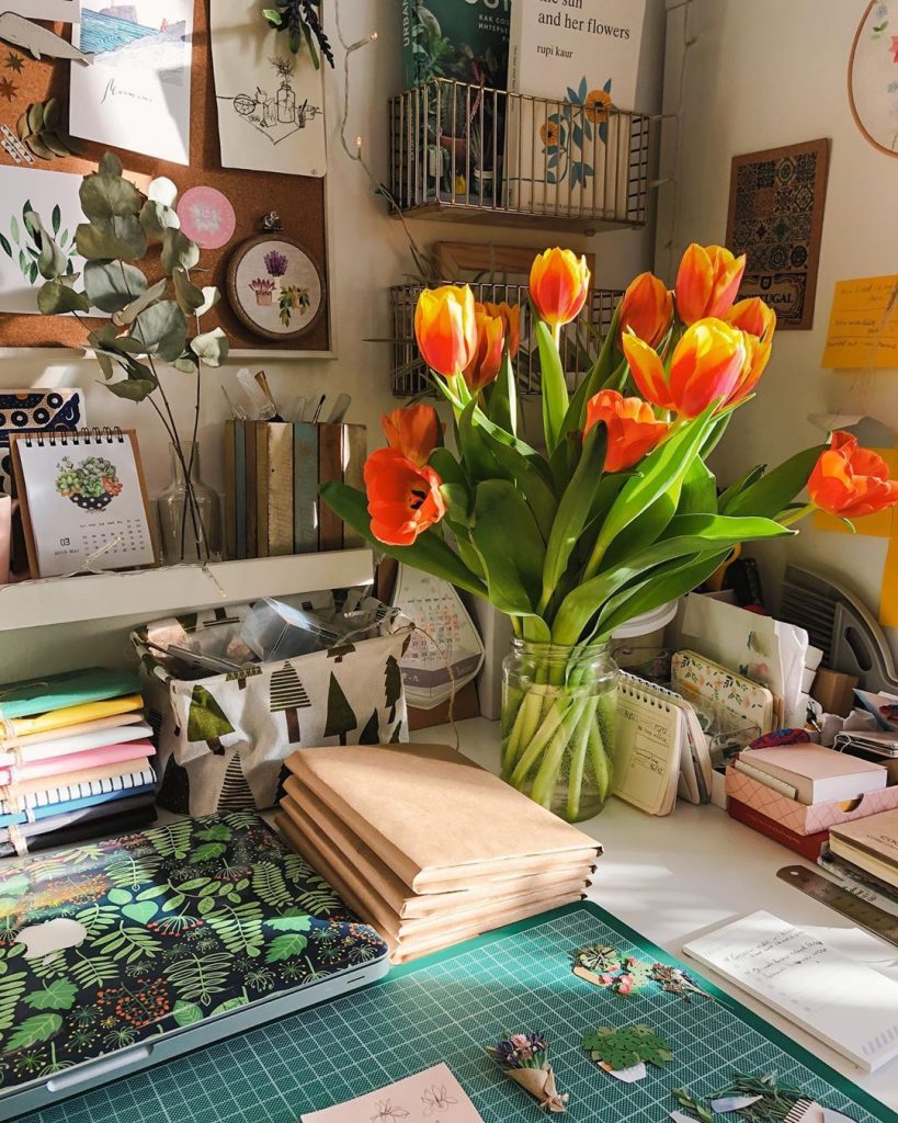 Hier ist ein seltener Blick auf die Arbeitsstation des Genies, die sie am internationalen Frauentag veröffentlicht hat. Diese Frau lebt und atmet Pflanzen, und wir sind so eifersüchtig auf diesen She-Shast von einer Arbeiten. Von den pulsierenden Tulpen und verschiedenen Pflanzen, die ihren Schreibtisch verweigern, der Pflanze gedruckt Kissen und Koffer über ihrem Zeichnungsgitter - sogar ein Buch mit dem TitelDie Sonne und ihre Blumen Dies ist ein Thema, dass wir ernsthaft zurückkommen können.