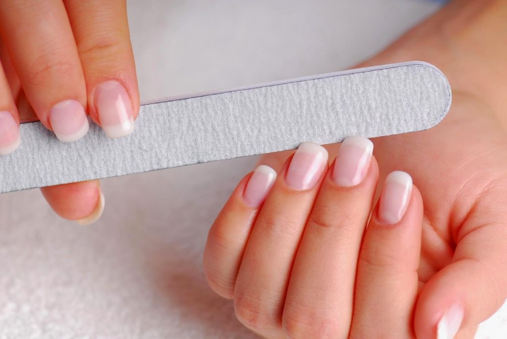 Die meiste Zeit drehen sich ein bisschen länger als Ihre natürlichen Nägel, was bedeutet, dass Sie einige übermäßige Nagelverlängerungen haben, um loszuwerden. Fassen Sie sie einfach ab, um zusätzliche Länge zu entfernen, und der Rest des Verfahrens wird noch schneller. Wenn Ihre Tauchpulvernägel kurz sind - einfach diesen Schritt überspringen.