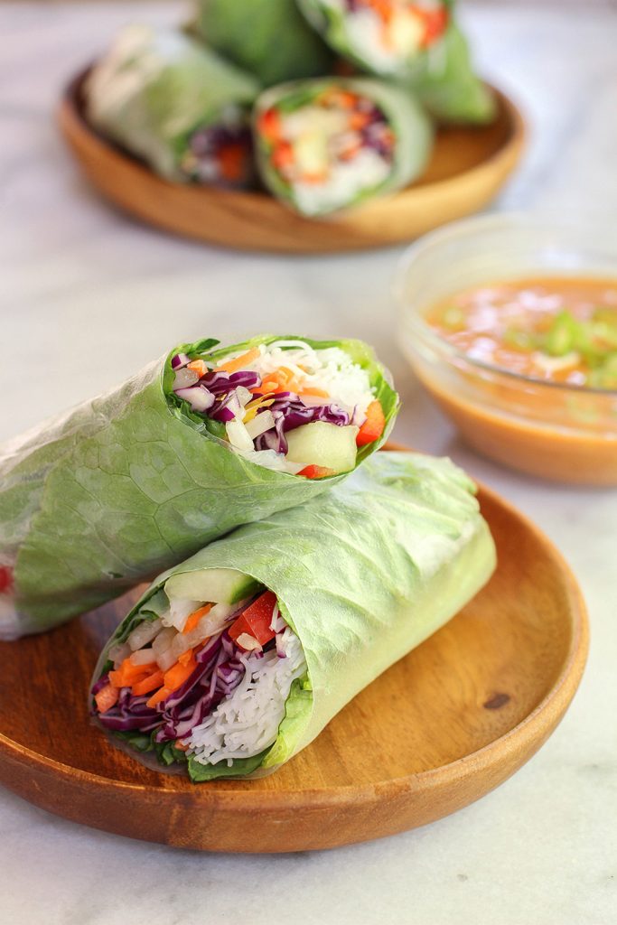 Sie werden Frühlingsrollen genannt, aber Sie können sie tatsächlich das ganze Jahr über machen. Frühlingsrollen sind sehr leicht, da sie mit Reisverpackungspapier, Reisnudeln und frischem Gemüse hergestellt werden. Innerhalb können Sie unterschiedliche Füllungen haben, aber die allgemeine Idee besteht darin, Frühlingsrollen mit blättrigen Grünen, Reisnudeln und Gemüse wie Karotten und Gurken zu halten. Es ist am besten, Frühlingsrollen mit einer schweren Sauce zu servieren.