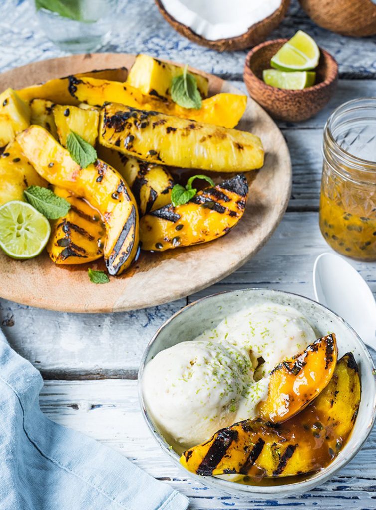 Nichts sagt der Sommer wie der Geschmack von exotischen Früchten. Sie können sie natürlich frisch essen, aber Sie können sie auch mit ein wenig Mühe in ein köstliches Dessert verwandeln. Frische Ananas, Pfirsiche und Mangos schälen und hacken, dann grillen Sie sie, bis sie fertig sind. Mit einer Sahne aus Vanille, Kokoscreme und Mascarpone servieren. Fügen Sie etwas köstliche orangefarbene Sauce für den bemerkenswertesten Geschmack aller Zeiten hinzu.