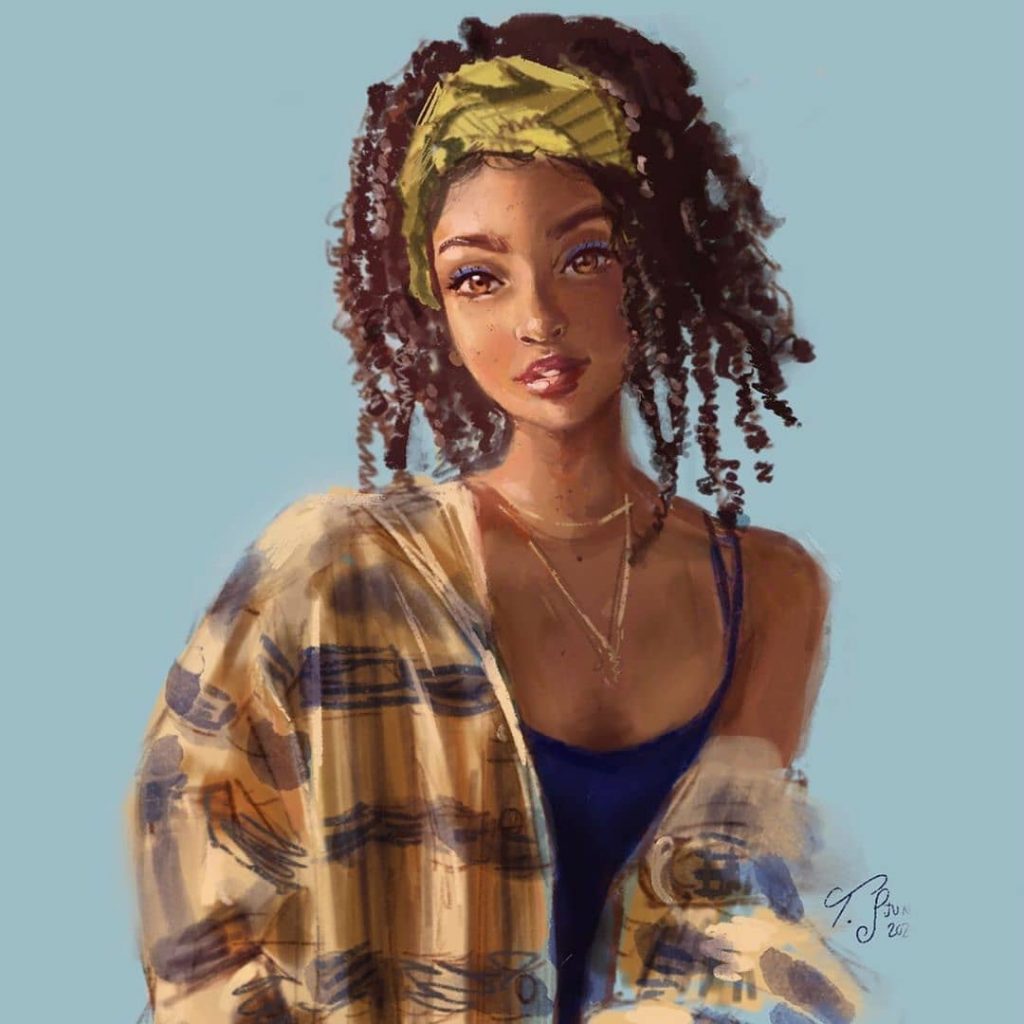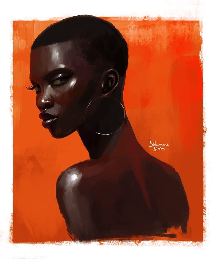 Schauen Sie sich die Wangenknochen auf dieser summten und melanierten Schönheit an. Ihre Funktionen sind atemberaubend, und der verbrannte orangefarbene Hintergrund ermöglicht ihr erstaunlicher Hautton, zu glänzen. Der Künstler selbst sagte, dass dunkle Haut ihr Favorit ist, zu malen, da "Malerei, dass diese Highlights einfach so befriedigend waren."