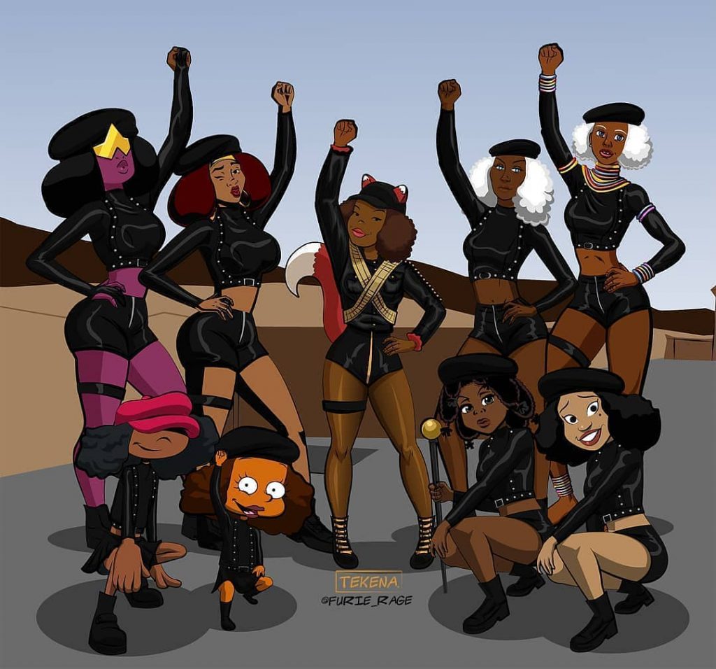 Hier ist ein Übernehmen einer beliebten animierten Serie, mit den Frauen, die in schwarzem Panther aussieht, und erhebt ihre ersten Solidarität. Von Granat nach Kanarary, ihre Outfits sind Feuer, und dieses Bild spricht Volumina.