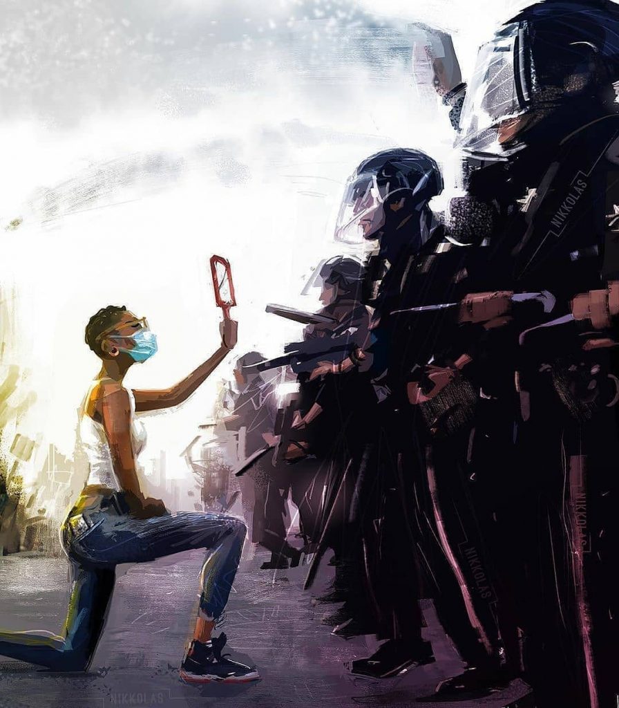 Dies ist eines der mächtigsten Bilder der Bewegung, die wir bisher gesehen haben. Darin kniet sich eine junge schwarze Frau, die einen Spiegel an der bewaffneten Polizei vor sich hält, damit sie sehen können, was sie geworden sind.