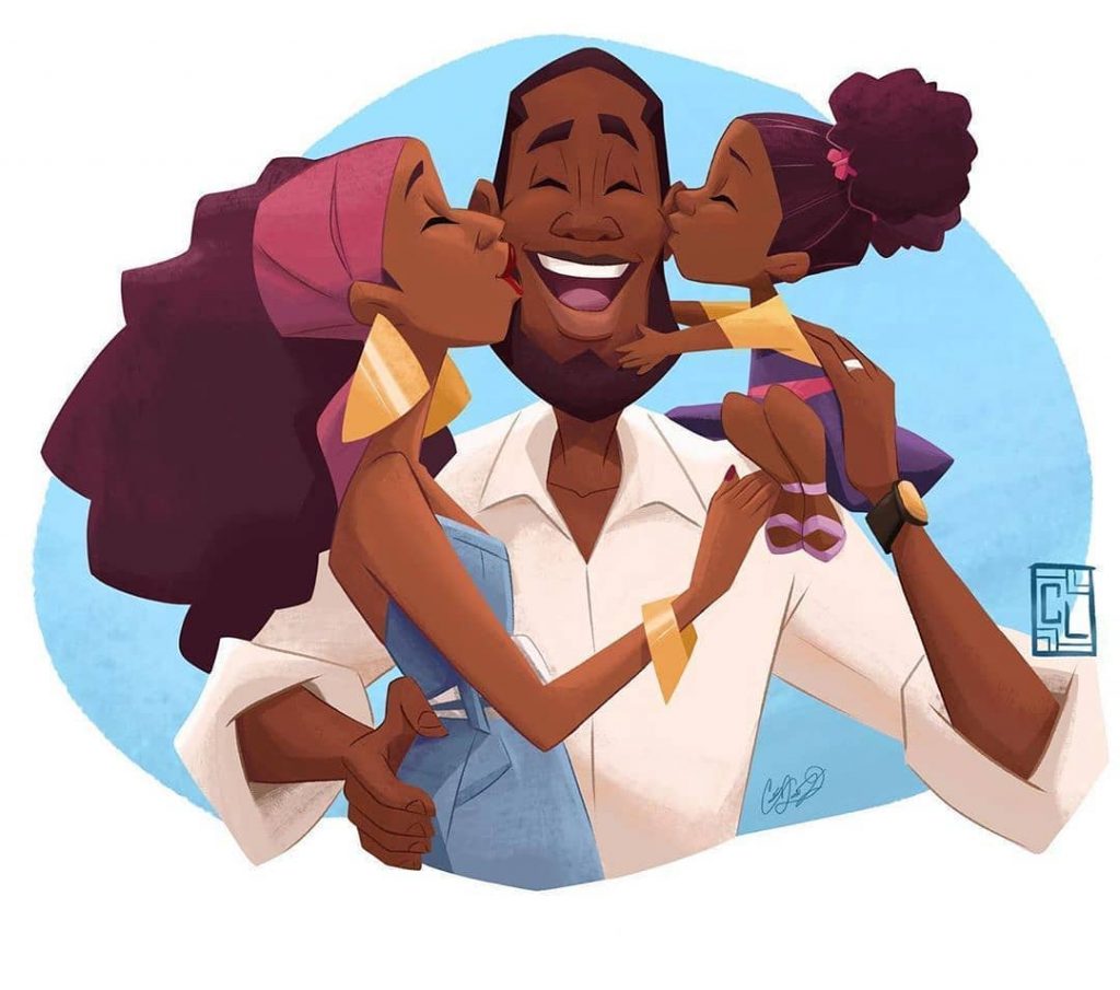 Sie sehen oft nicht oft schwarze Liebe in Familien, die so positiv dargestellt sind. Hier, zwei natürliche behaarte Schönheiten, Frau und Tochter, dolen sich dem geliebten Mann in ihrem Leben Wangenküsse aus. Wir lieben, dass die Damen Hase ihr natürliches Haar schaukeln, und diese Mutter hat ein Kopftuch auf.