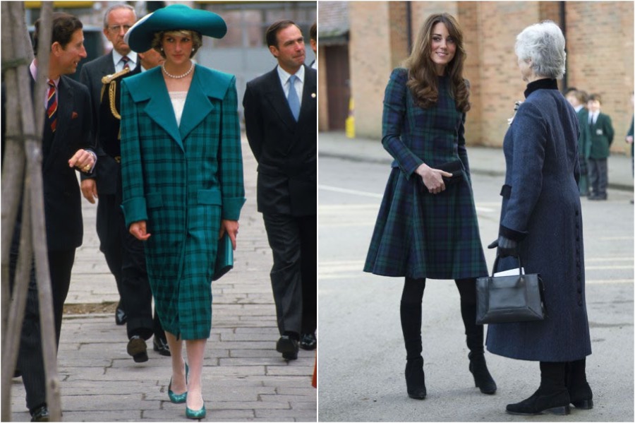 8. Das grüne Tartan-Mantel von Dianas sieht aus wie eine solche Aussage, aber Sie müssen sich daran erinnern, dass solche breiten Schultern in den 80er Jahren ein Trend waren. Und natürlich trägt Kate hier ein viel maßgeschneidertes Kleid / Mantel im gleichen Druck und in derselben Farbe.
