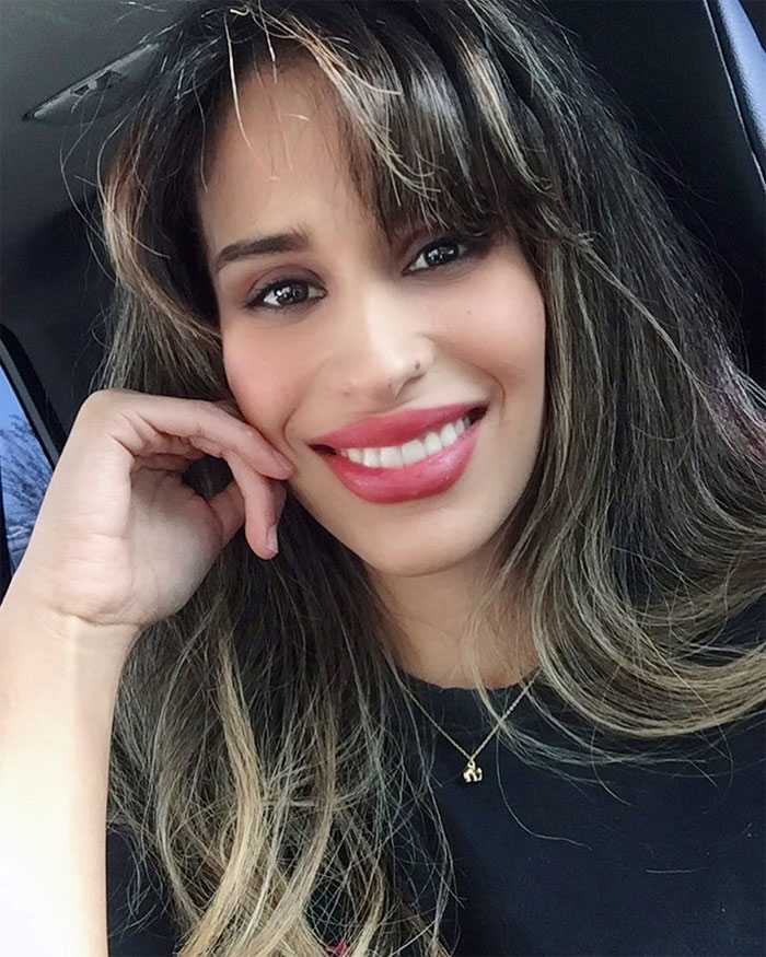 Als Yudie erwähnt, bemerkte Cinderella Ears. Hier ist sie mit einem rosafarbenen Lippenstift, doppelten Reifen-Ohrringen, mit einem schwarzen Rollkragen-T-Shirt mit einem türkisfarbenen Spaghetti-Riemenoberteil und Halskette, die oben geschichtet ist. BRB, erstellte diese Outfit Inspo sofort.