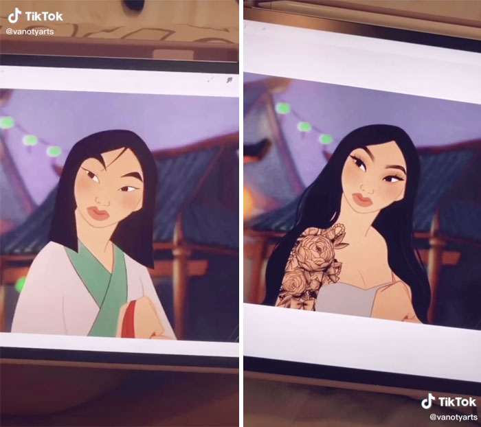 Für Mulan wollte der Künstler etwas dramatischeres tun, also fügte sie ein heftiges Cat-Auge und eine auswirkungsvolle schwarze Rose-Schulter / Armhülse hinzu. Mulan verwandelte sich in ein Baddie mit einem würzigen Abendkleid und fließenden Erweiterungen. Wir würden davon träumen, an unserem Freitagabend in sie zu laufen.