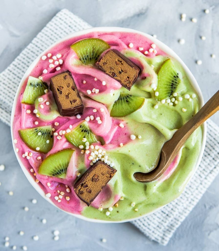 Wir können wirklich nicht über diese Nicecreme-Schalen bekommen, weil sie wie die erfrischende Essenz des Sommers aussehen, und auch die Farben kommen jedes Mal so verträumt und cremig. Diese ist halb Himbeer, halb Matcha, mit Kiwi- und Keks-Teig-Protein-Barbits. Sie war besessen von der Kombination, und wir sind auch tbh.