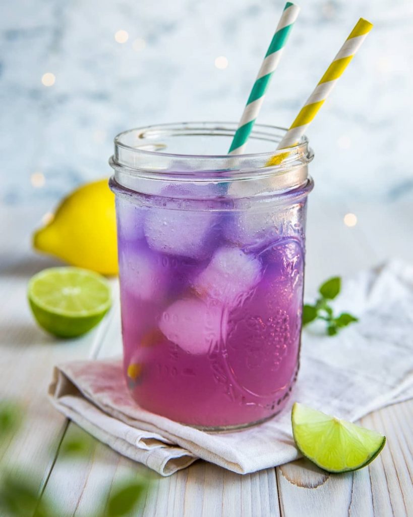 Und ja, sie macht Getränke, und sie sehen aus wie etwas, mit dem ein Einhorn aufkam. Die wunderschöne und surreale Farbe aus diesem Tee kommt von Schmetterlingspa-Tee. Allein ist es eine blaue Färbung, aber wenn Sie einen Zitrussaft hinzufügen, wird er ein wunderschönes Rosa und einen schönen Rosa und einen lila. Der Geschmack ist leicht süß mit dem kleinsten Hauch von Blumen.