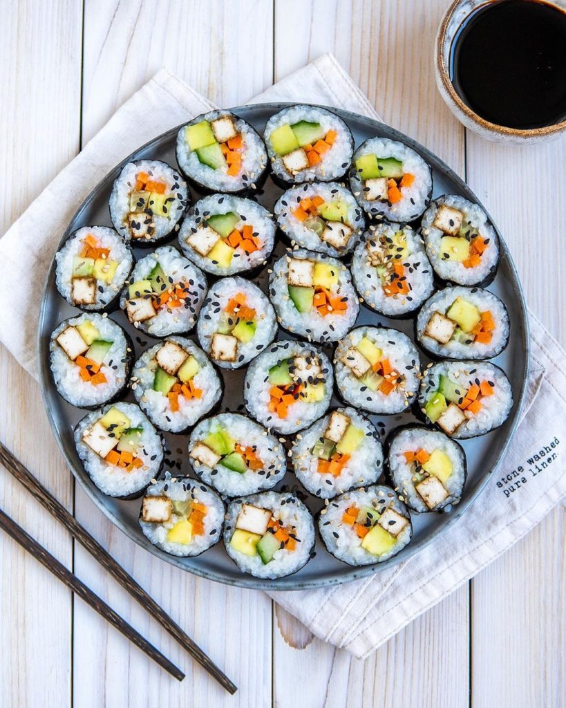 Sushi könnte für einige einschüchtern, aber wenn es vegan ist, werden die Risiken viel niedriger. Dieser ist mit Avocado, Gemüse und gebratenen Tofu gefüllt, das sie ihre "Standard-Sushi-Füllung nennt". Wichtiger Hinweis: Fügen Sie Ihrem Sushi-Reis Reis-Essig und Ahornsirup hinzu, um einen nuzentrierteren Geschmack zu erhalten.