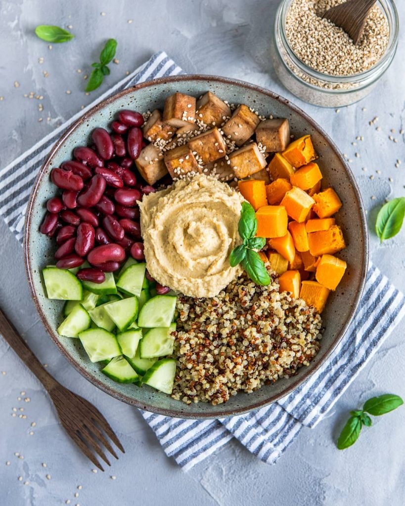 Und während wir niemals mit den Krepes und dem Faux-Eis ausgehen können, können wir jedoch niemals die Stadt in ein herzhafter Schalen machen. Schüsseln sind leicht zu montieren und herzlicher als Salate. Dies ist eine Buddha-Schüssel, gefüllt mit gebratenem Tofu, einem Kidney-Bohnen, Quinoa, Gurken, Hummus und gebackenem Kürbis. Der Bespritz des Basilikums beendet es wirklich ab - viel Eiweiß, aber auch viele andere wichtige Nährstoffe.