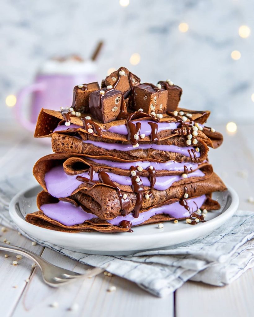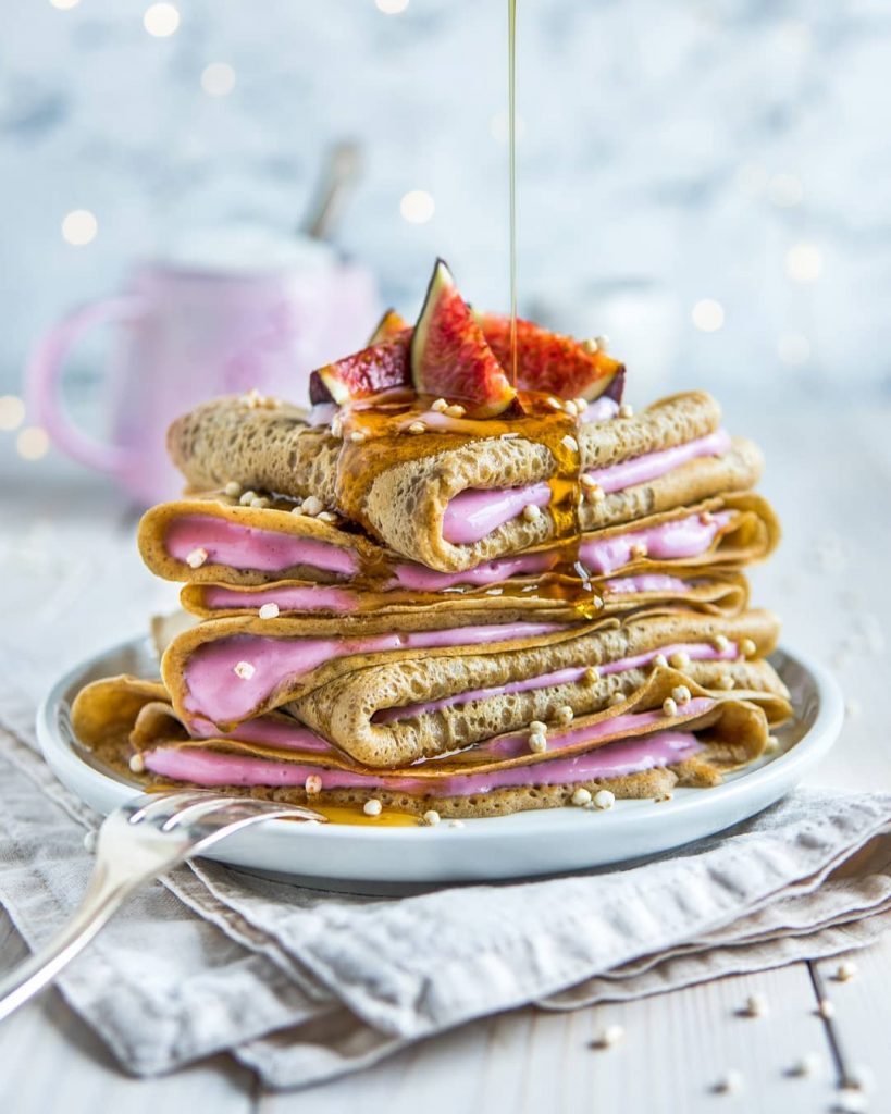 Evas Crepes sind auch von der Kette. Als sie ihren Freund in Blogger-Freundin in Berlin besuchte, machte sie diese Crêpes mit Himbeer-Soja-Joghurt, Feigen und Ahornsirup gefüllt. Sie weist darauf hin, dass Crepes für Vielseitigkeit wunderbar sind, da Sie sie grundsätzlich mit irgendetwas füllen können, was Sie wollen. So viele Optionen! Wie ein Sandwich, aber viel besser.
