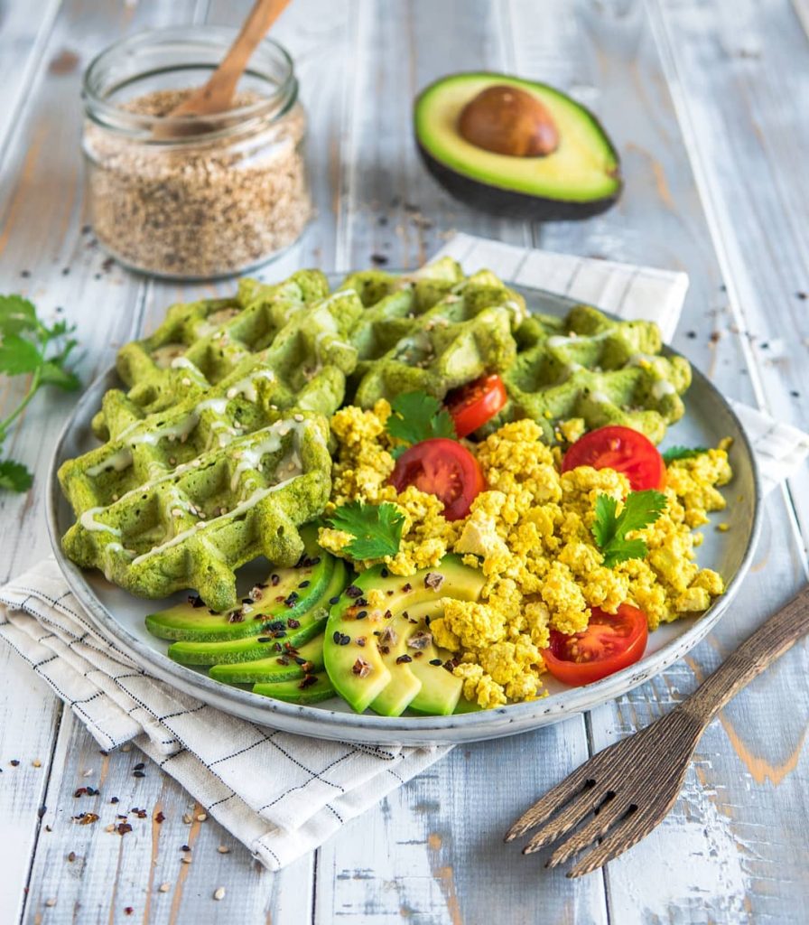 Süßigkeiten sind definitiv eine EVA-Spezialität, aber diesmal erhalten die Waffeln ein kaumer Remix. Grüne Erbsenwaffeln werden mit Tahini serviert, ein Tofu-Scramble, Tomaten, Koriander und hübsche Avocado-Slices mit Sesam-Samen. Es ist mit Eiweiß verpackt und arbeitet zum Frühstück, Mittag- oder Abendessen.