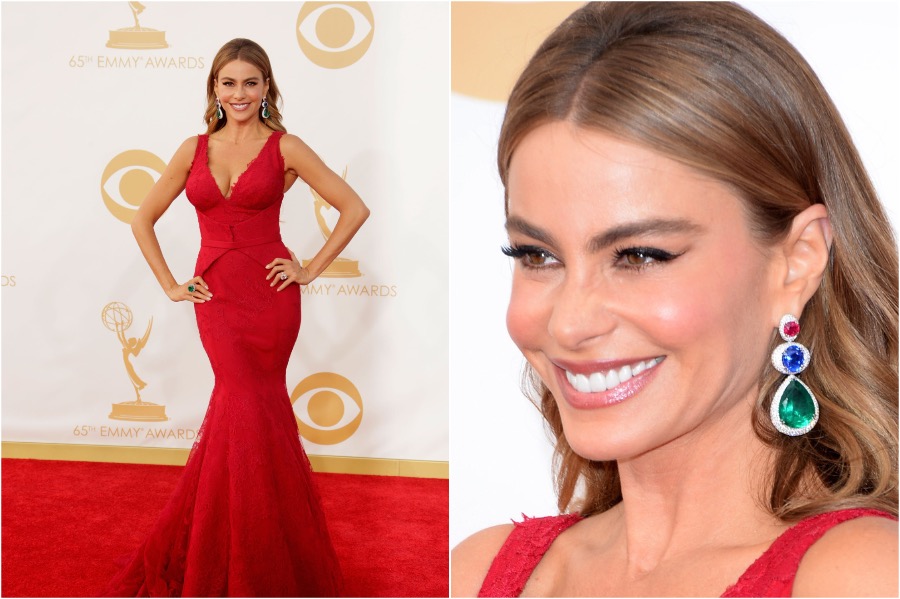 Wenn Sie Sophia Vergara sind, werden Sie nicht zufrieden sein, wenn Sie nur einen Edelstein tragen. Sie müssen sie alle auf einmal tragen, wenn möglich. Also traf sie wirklich Rubin, Saphir- und Smaragd-Ohrringe an den Emmys. Und dann entschied sie sich, einen Diamantring auf jeder Hand für ein gutes Maß zu tragen.