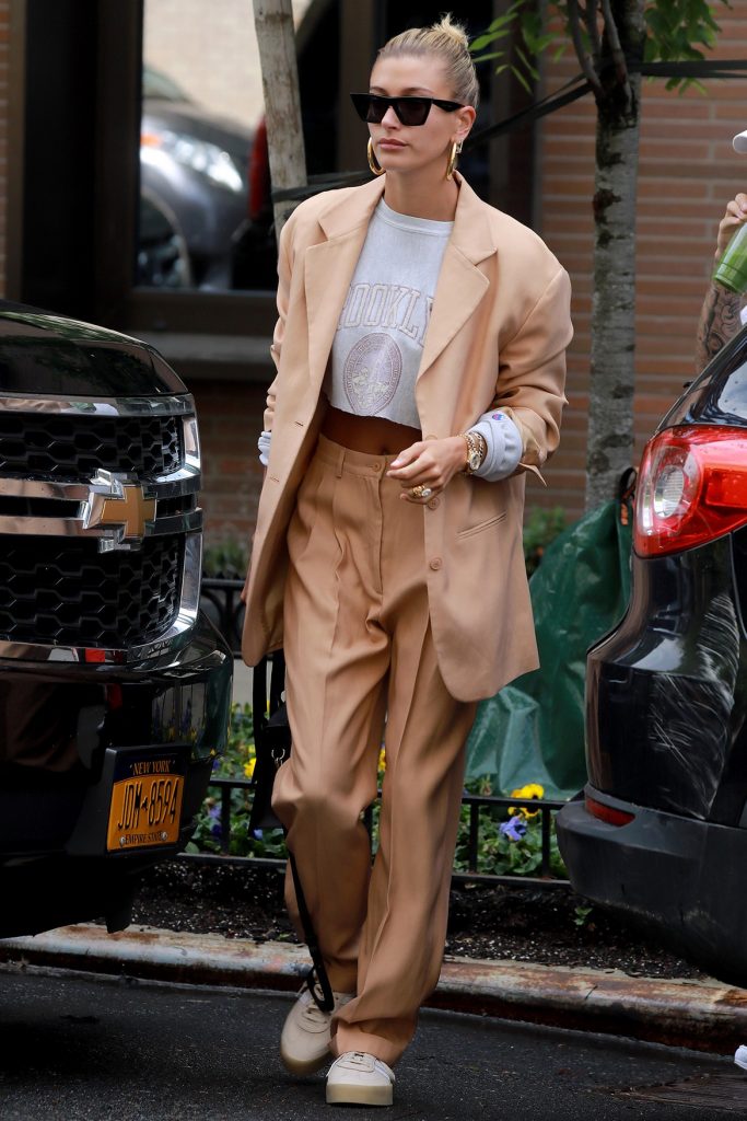 9. Kamel getönten Anzüge wird nie aus der Mode gehen, nicht die Silhouette Rolle. Hier ging Hailey mit dem Fluss, ein altes beschnittene T-Shirts, vielen Schmuck Schichtung und dicke Sohlen Turnschuhe. Dieser Look ist sehr 1980er Jahre der 2000er Jahre treffen, vor allem mit der geometrischen schwarzen Sonnenbrille. Mörder!