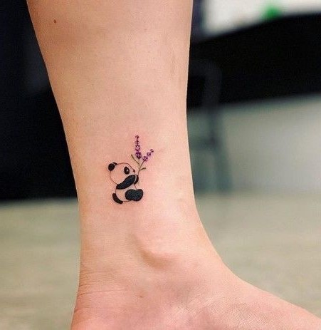 Ein kleiner Panda mit einer Lavendelblume in den Händen. Klein, bunt und unendlich süß!
