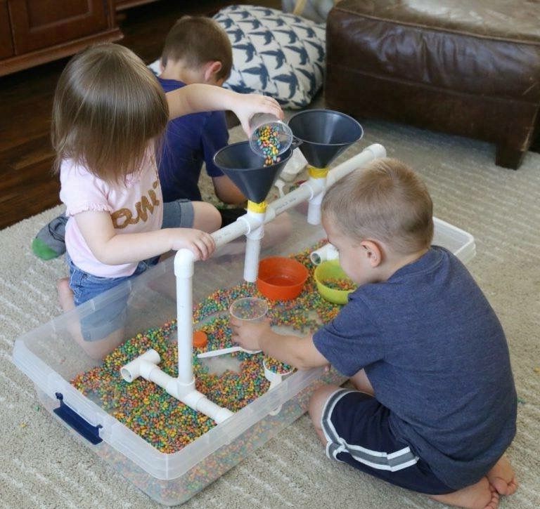 Für die kleinsten. Füllen Sie einige Gläser mit Materialien, die eine andere Konsistenz haben: Pasta, Reis, Salz, Mehl. Geben Sie Kindern andere leere Gläser, einen Löffel und die Anweisungen. Alle Materialien durchführen, ab dem größten bis zum kleinsten. Sie werden ein großes Werk der Motorkoordination machen, und sie werden auch Spaß haben, sie hierher fallen zu lassen. Oder nehmen Sie einen großen Container, erstellen Sie einen Kreislauf mit Rohren und etwas Trichter, füllen Sie es mit farbigen Murmeln und lassen Sie sie mehr amüsieren.