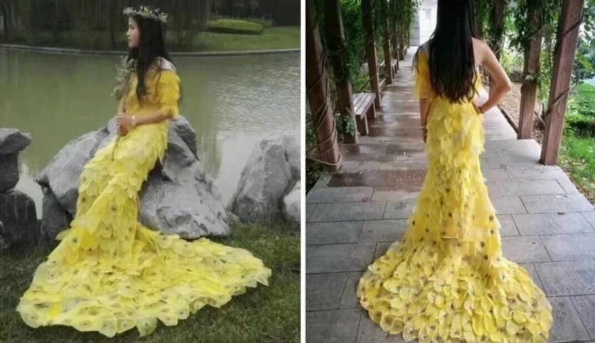 Oder um ein anderes Extrem zu berühren, können Sie ein Kleid aus Sonnenblättern tragen.