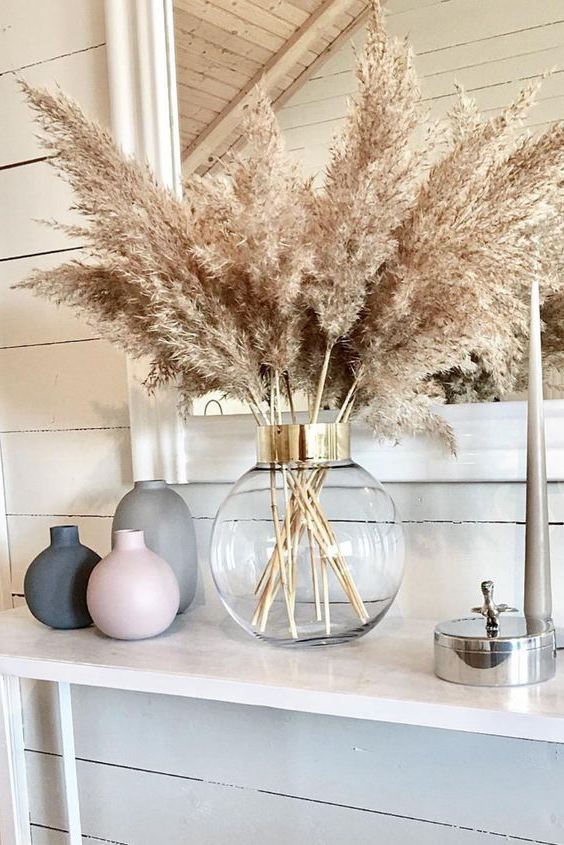 Um kleine und einzigartige Möbelstücke zu schaffen, können Sie nur ein paar Blumen nehmen, die Pampas Gras kurz schneiden und in ein Glasgefäß platziert werden. Oder Sie können die langen Stiele in eine Ecke des Wohnzimmers in einem hohen Vase setzen, das zum Stil Ihres Hauses passt. Ein anspruchsvoller Dekor, der der vorsichtigsten würdig istHome Stylist.