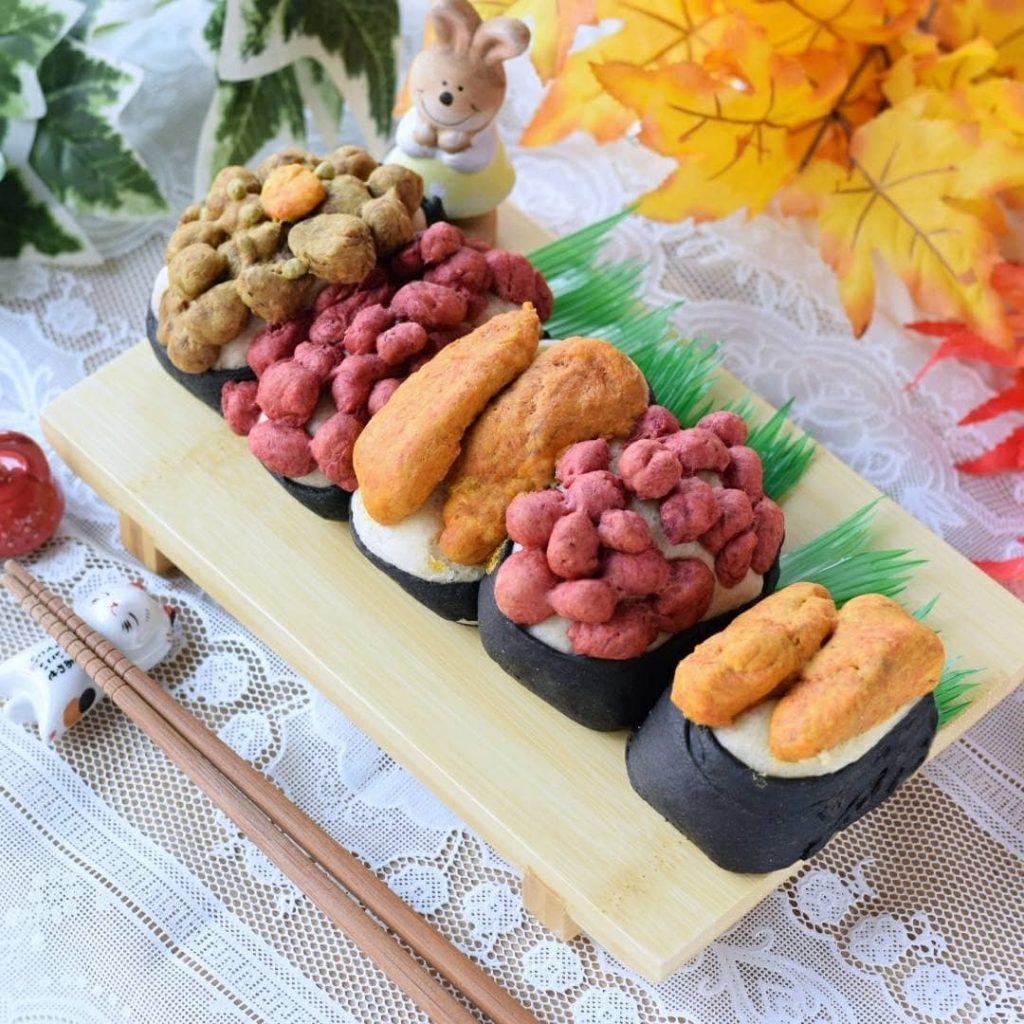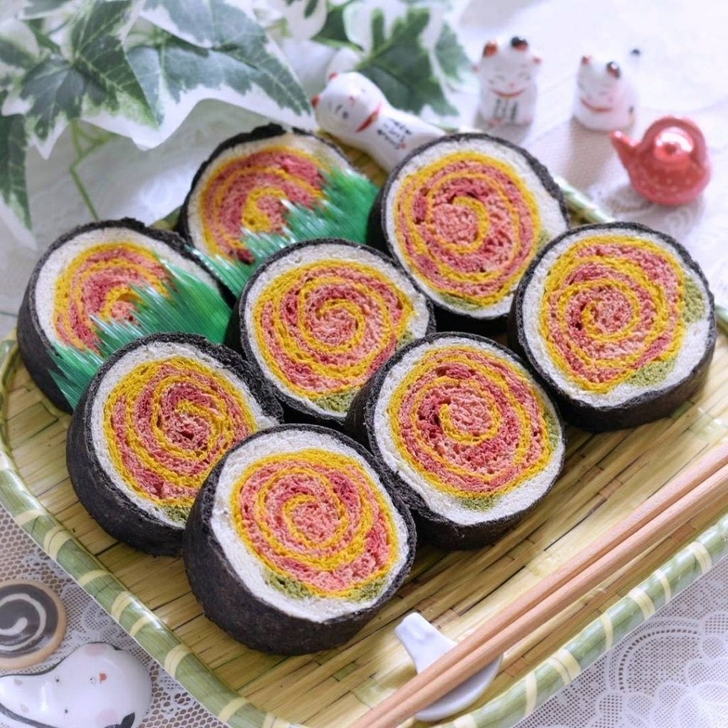 Um diese Faux-Sushi-Rolle zu erstellen, die der Schöpfer als "Rose Deco Sushi" beschreibt, verwenden sie schwarzen Kakao, Spinat, Pulver und roter Rüben als Hauptbestandteil.
