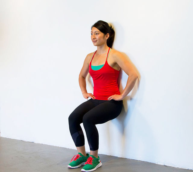 Sie können dies mit Wänden im Wohnzimmer tun, oder überall mit Platz für Sie, um sich bequem zurücklehnen. Erstellen Sie einen Winkel von 90 Grad mit zwei Füßen, sitzend auf der Wand, der sich an der Wand lehnt, ähnlich, wenn Sie auf einem Stuhl sitzen. Halten Sie die Haltung. Diese Aktion klingt nach, als ob es nicht schwer wirkt, aber es wird wirklich viel Energie dieses Körpers brauchen.