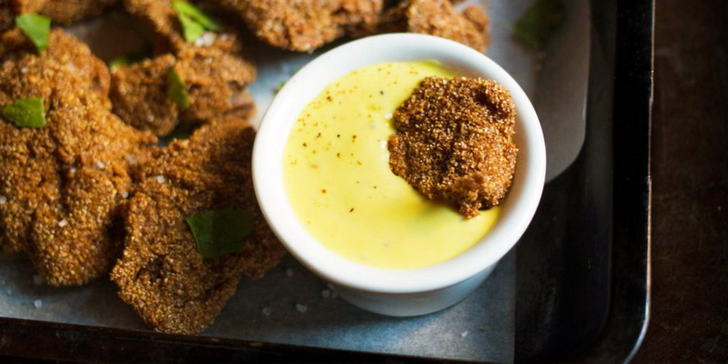 Nun, sehr appetitlich Hähnchenleber in Friteuse gebraten. Nähe können Sie Französisch frites setzen. Die Käsesoße ist für dieses Gericht geeignet.