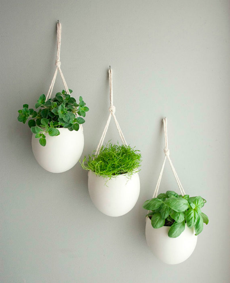 Schaffen Sie eine Atmosphäre im Hause und platzsparende hängende Töpfe oder Glasgefäß, die kreativ auf dem Seil aufgehängt werden können, die Hauptsache, alles zu tun, in der gleichen Farbe und Stil.