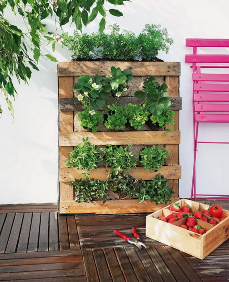 Paletten - ist heute eine unverzichtbare Sache in der Innenarchitektur. Stilvolle und bequeme Lösung für kleine Wohnungen - senkrechte Flächen. Nun ist es sehr oft vertikal stehende Palette für die Dekoration und Bepflanzung von Gemüsekulturen verwendet. Und es sieht sehr modern und umweltfreundlich. Sie es nicht bereuen!