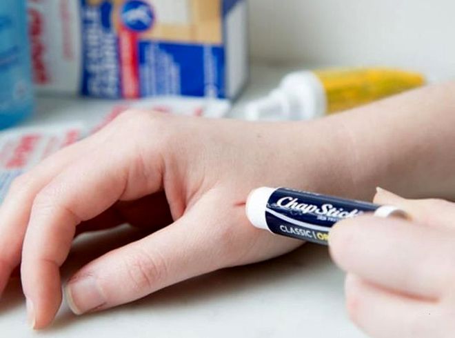 Der Ort der Schnitte oder flachen Kratzer kann mit dem üblichen hygienischen Lippenstift "heilen" sein, der sich in jeder Kosmetik befindet. Es funktioniert nicht schlechter als antiseptische Mittel, die die Wunde umhüllt und es vor Infektionen schützt.