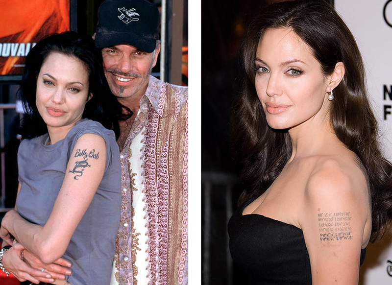Angelina Jolie - einer dieser Sterne, die seinen Körper mit zahlreichen Tätowierungen schmückten. Jedes ihrer Tattoo, das einem Event oder einer Person gewidmet ist. Es ist wahr, es gibt ein Tattoo eines Sterns, das bereut. Also verheiratet mit Billy Bob Thornton Hollywood-Schönheit, die den Namen ihres Liebhabers gefüllt hat, aber nachdem er mit ihm Schluss gemacht hat, hat Angelina Jolie beschlossen, das Tattoo zu entfernen. Nun macht an derselben Stelle das Geburtsdatum von Kindern Jolie und Pitt. Es wird gesagt, dass die Schauspielerin nach dem Umbruch von Brad Pitt entschieden hat, das Tattoo loszuwerden, der daran erinnert.