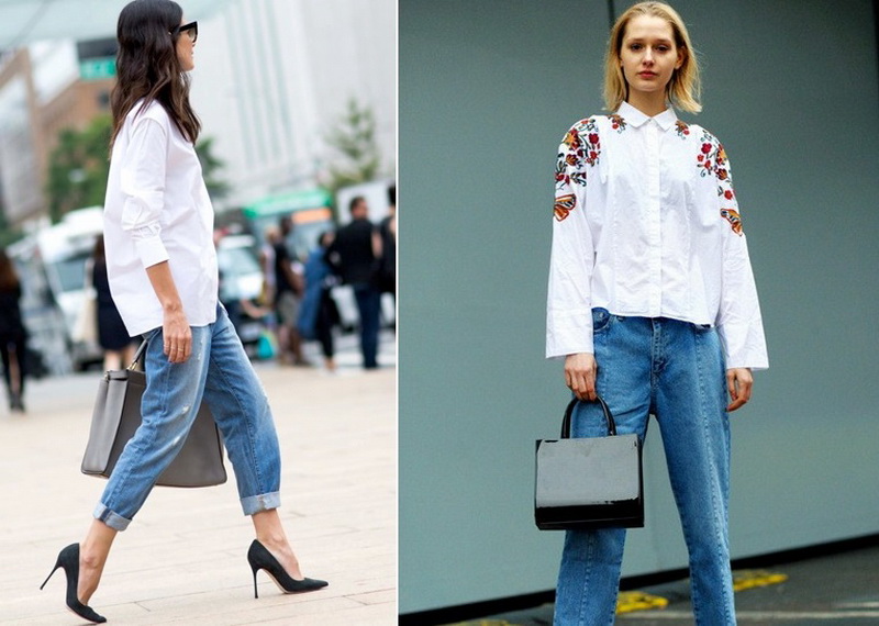 Dieses Kit ist einfach unverzichtbar in der Garderobe jedes Mädchens. Stilvolle Jeans und ein weißes Hemd, das Sie im Alltag tragen können, und an einem Datum werden Sie das Bild mit Fersen und interessantem Zubehör abschließen.