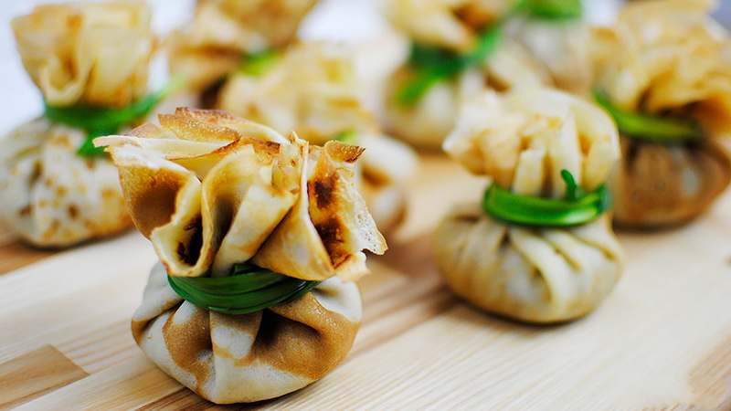 Traditionelle Pfannkuchenknoten mit Hühnchen, Pilzen, Käse und Grünen - ein echter Fund für die Besitzer, da die Zutaten der Füllung in jedem Laden an einem relativ günstigen Preis gekauft werden können, und die Pfannkuchen selbst werden sehr befriedigend und originellisiert.