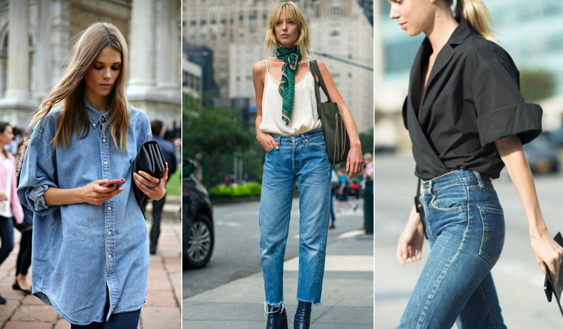 Freunde mit einem weißen Hemd, Overall mit einem T-Shirt und Nieten, Skinnie mit Tops, einem Hemd mit Bluse - Optionen können bis unendlich aufgelistet werden. Wenn die Kleiderordnung Ihres Unternehmens strengere Bilder verpflichtet, empfehlen Sie den Denim, mit grundlegenden Garderobenobjekten zu kombinieren.