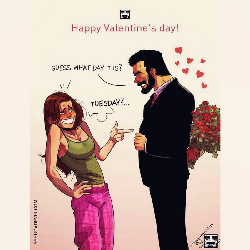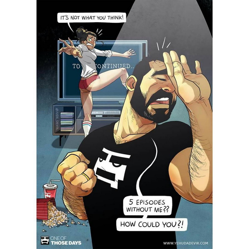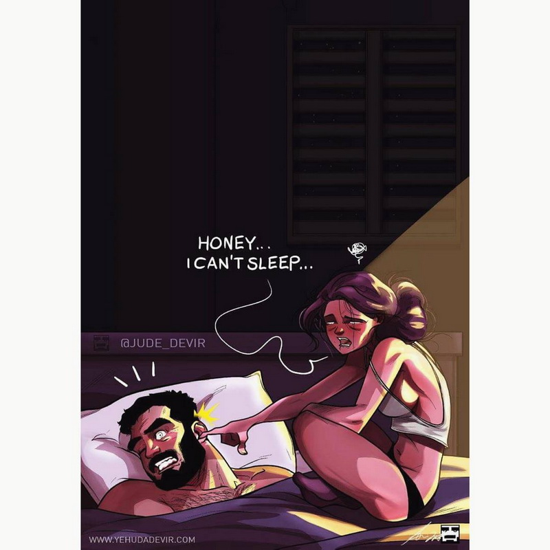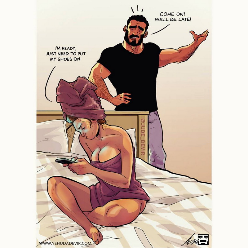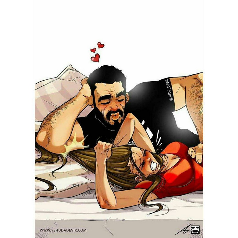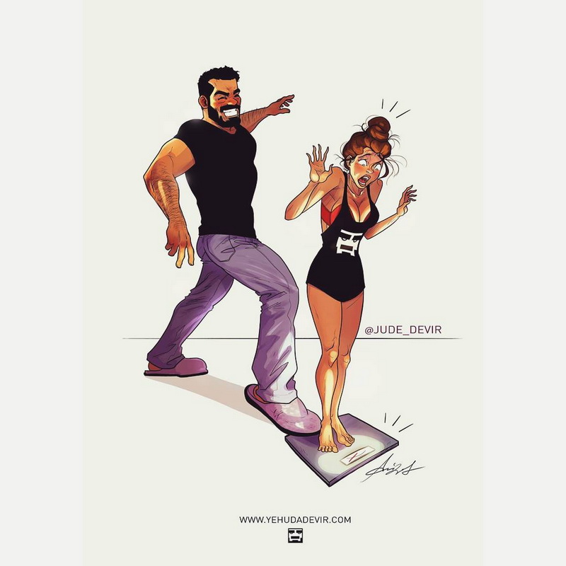 Gewöhnliche Familienwoche inspirierte Illustrator-Künstlerin Yehudu Adidi Devira von Israel, um groteske Comics zu schaffen. Fröhliche Bilder zeigen den täglichen Routine von Menschen in der Liebe. Sie schwören, argumentieren, erscheinen voreinander in den lustigsten und nicht immer bequemen Lebenssituationen.