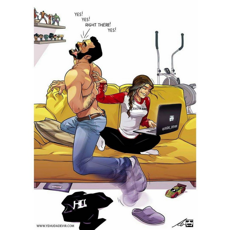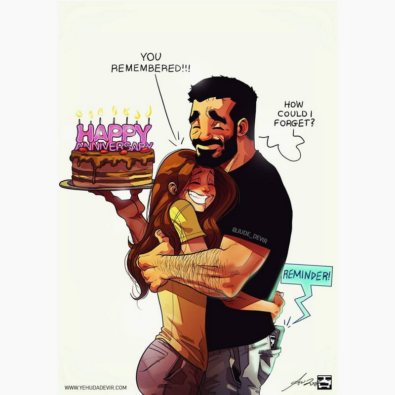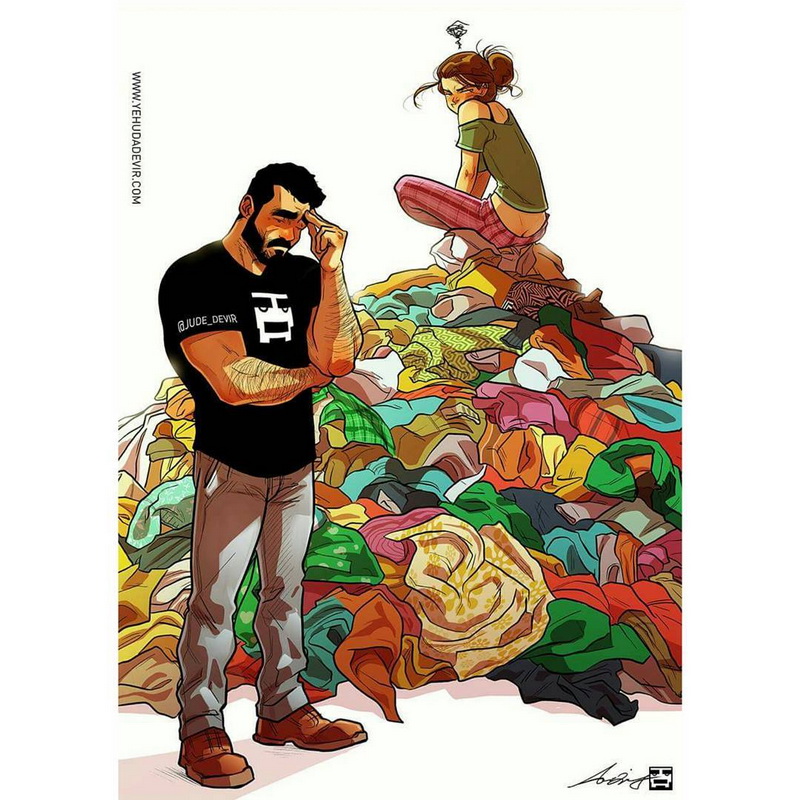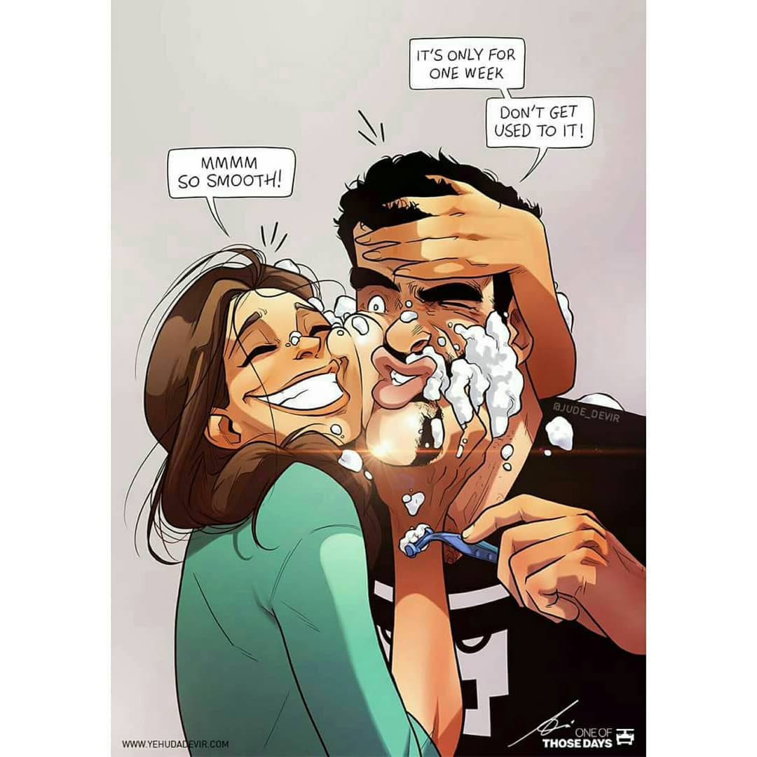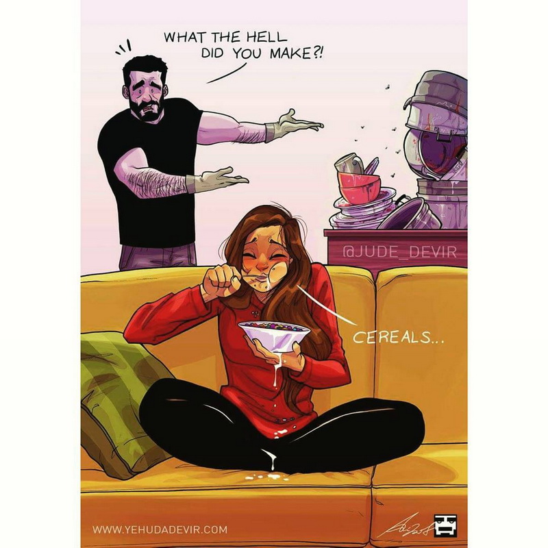 Das Familienleben ist nicht nur Romantik und Abendessen mit Kerzen, sondern auch Waschen, Reinigen und Waschen von Geschirr. Dies ist jedoch kein Grund, traurig zu sein oder zu schwören. Zu dieser Schlussfolgerung kam undYehuda adi devir (Yehuda adi devir) - Ein berühmter Illustrator von Tel Aviv, der mit Humor sein Familienleben mit der Frau Mayas darstellt.