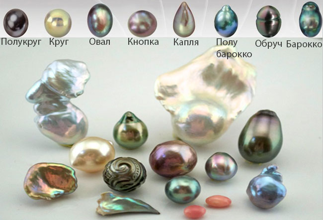 Perlen sind so autark, die nicht spezielle Verarbeitung erfordert, Schleifen oder Schnitte, im Gegensatz zu anderen Edelsteinen. In der Natur gibt es acht Formen der Perlen: ein runder eine ideale sphärische Form aufweist; halbkreisförmig mit einem kleinen Streuen an den Seiten; oval - breit in der Mitte und symmetrisch um die Kanten verengen; pale förmig; in Form eines Knopfes und Reifen; Barock - völlig frei von Symmetrien von Perlen; Polburkko, in der Nähe oval oder ein Kreis, aber leicht asymmetrisch.