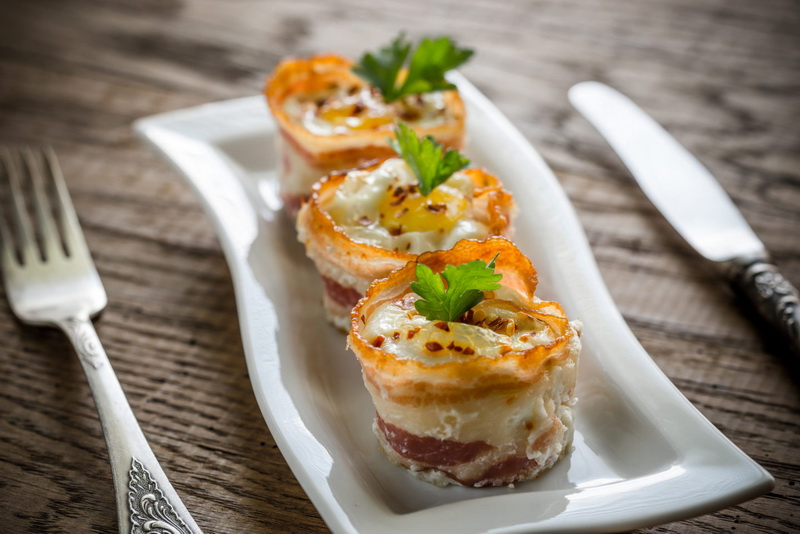 Für diejenigen, die das Frühstück einer Mahlzeit lieben, empfehlen wir, Eier zu kochen, die in Speck gebacken wurden. Dies ist eine wunderschöne Alternative zur üblichen Verglasung. Sie brauchen nur Eier, Speck und Grüns.