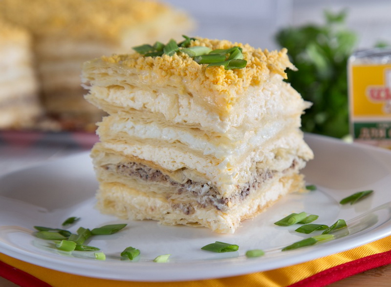 Alles Favorit "Napoleon" - nicht nur der beste Dessert für Tee, sondern auch eine gute Snackoption. Anstelle der üblichen Sahnekuchen fetten Sie die Paste oder übertragen Sie den Schinken und den Käse. Wir garantieren die Gästezufriedenheit.