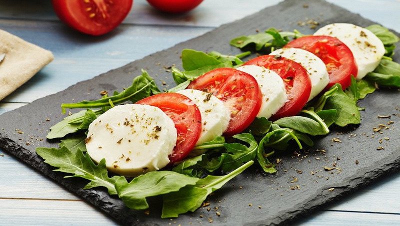 Salat Caprese - einfacher, mit dem Sie nicht kommen. Gleichzeitig köstliche Mozzarella, Tomaten und Basilikum - der Schlüssel zum einzigartigen Geschmack. Sie können CEDAR-Nüsse für Pikanten hinzufügen.