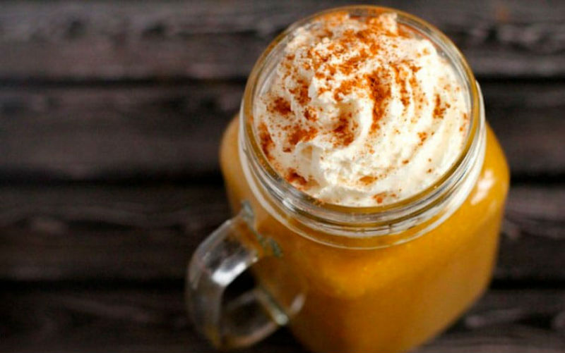 Kürbis ist perfekt mit vielen Gemüse und Früchten kombiniert. Sie können endlos mit Geschmack experimentieren. Unserer Meinung nach ist sehr ungewöhnlich, lecker und nahrhaft ein Kürbis-Smoothie mit der Zugabe von Bananen und Terminen.