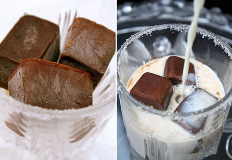 Schmelzen Sie die Schokolade, mischen Sie mit einer geringen Milchmenge und gießen Sie in Eisformen. Solche Würfel sind eine hervorragende Ergänzung zu Milch-Cocktails, Kaffee, verschiedenen Vitamin-Smoothies oder Haferflocken zum Frühstück.
