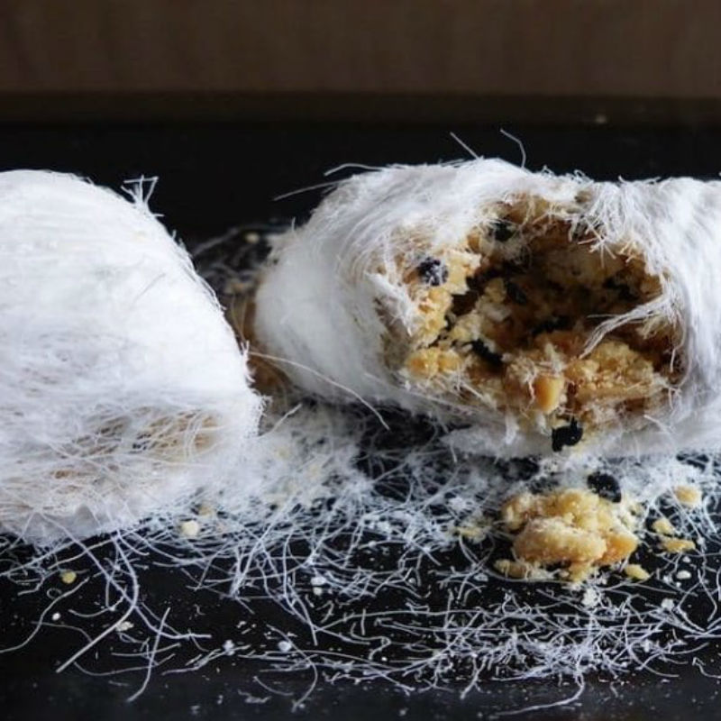 Äußerlich ähnelt dieses Dessert einem großen weißen Kokon. Nur erfahrene Meister können es richtig kochen. Sie dehnen sich dünn zu Zuckerfäden wie Nudeln aus. Und drehen Sie sie dann vor dem vorbereiteten Füllung um: Mischungen der zerquetschten Erdnuss und des Sesams.