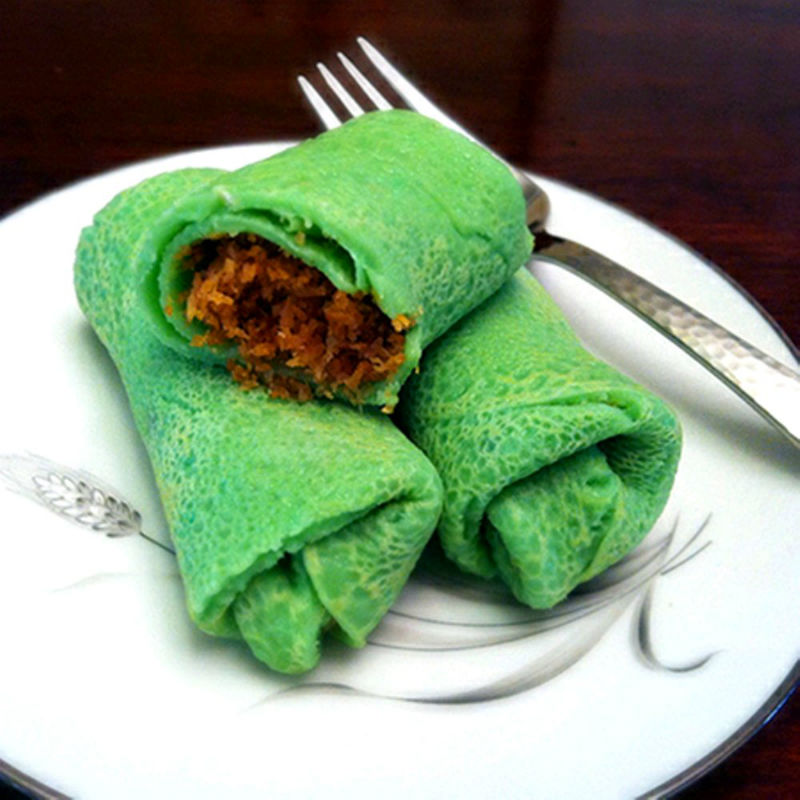 Dacar Gulung sieht aus wie unsere Lieblingspfannkuchen mit Füllung. Ungewöhnlicher grüner Teig besteht aus Reismehl und tropischen Pandanus-Blättern. Knusprige Füllung wird aus Kokosnuss und Palmzucker hergestellt.