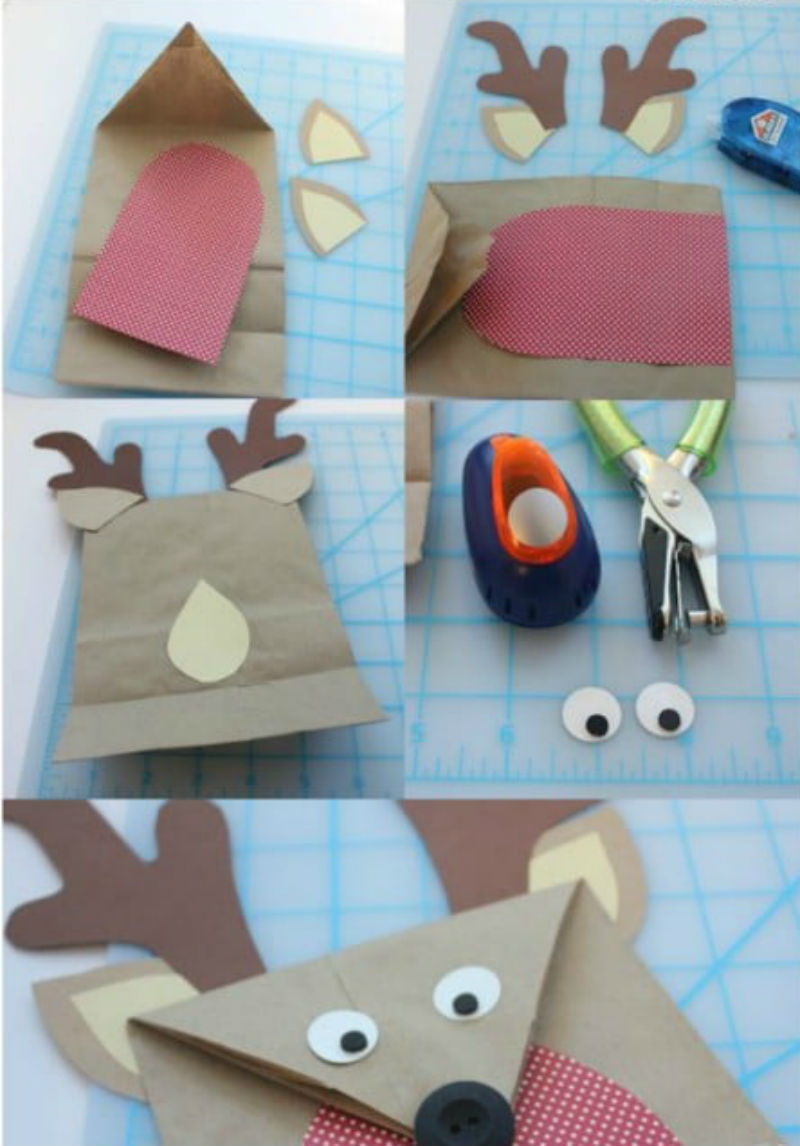 Wenn Sie ein kleines Geschenk haben, können Sie eine solche lustige Verpackung aufbauen. Sie können eine Papiertüte in einem niedlichen Hirsch mit einfachen Freundin drehen: Eine dicke Pappe, Stoff, Knöpfe und Knöpfe.