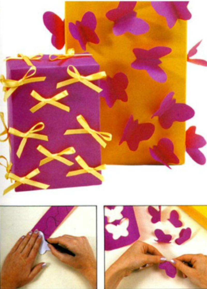 Miniaturpapier Schmetterlinge oder festliche Bögen helfen Ihnen, einen eleganten dreidimensionalen Effekt zu erzeugen.