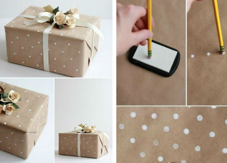 Ein einfaches Tupfenmuster macht jede Verpackung schrecklich süß. Alles, was Sie für die Arbeit brauchen: Bleistift mit Radiergummi, Papier, Farbe und Schwamm.